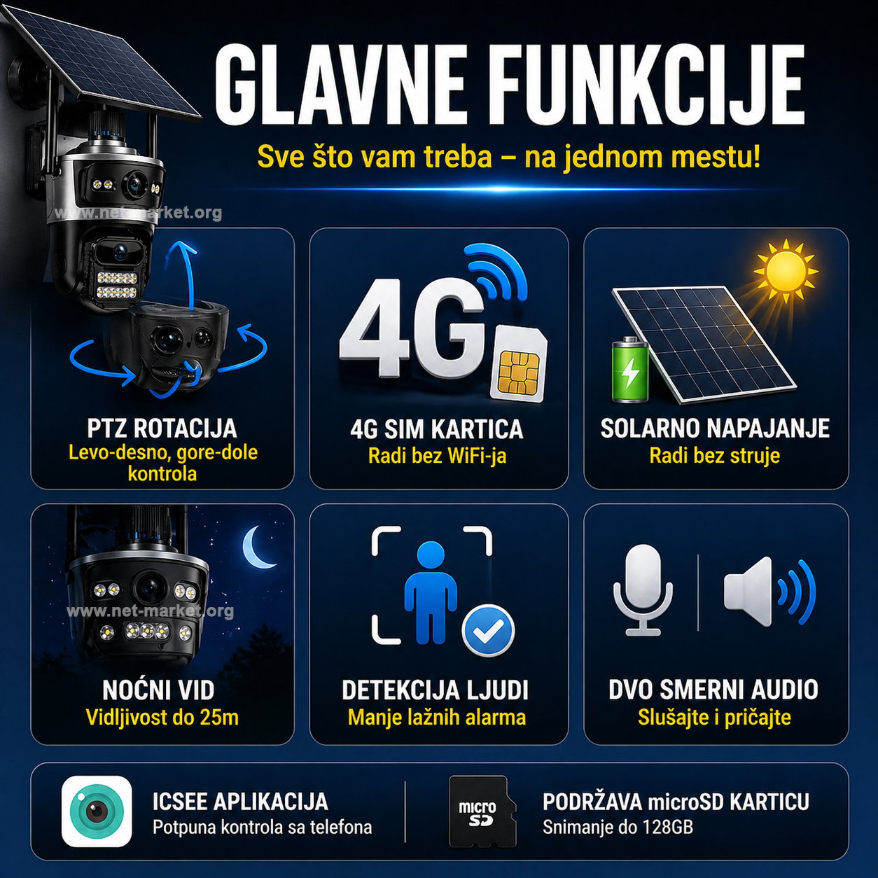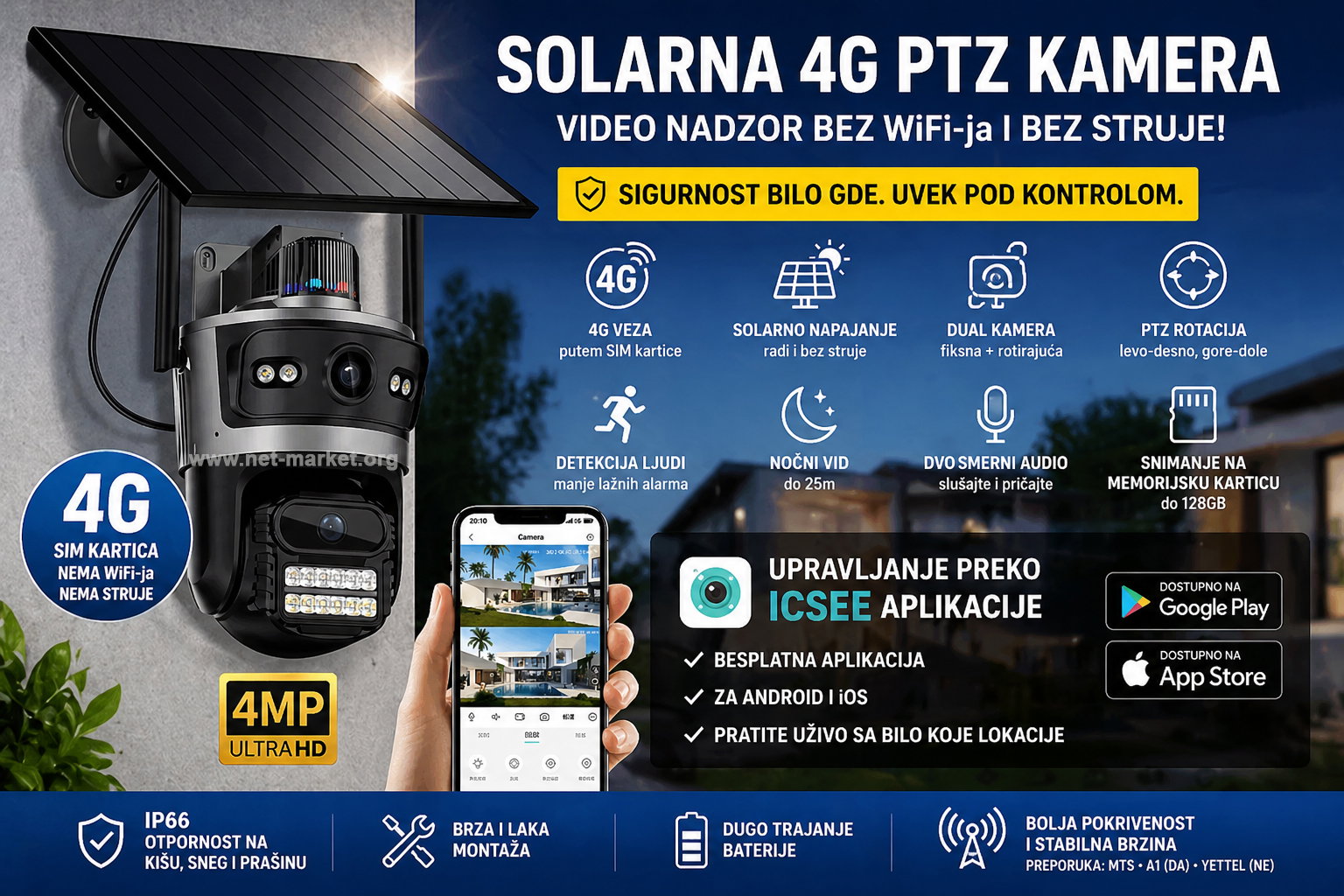 ✔ 4G SIM kartica – Kamera koristi mobilni internet, pa nije potreban WiFi. Testirana je sa MTS karticama i sa njima radi bez problema (preporuka zbog bolje pokrivenosti i stabilnije brzine), A1 takođe uglavnom radi bez poteškoća, dok se Yettel kartice ne preporučuju jer kompatibilnost može varirati u zavisnosti od tipa kartice.